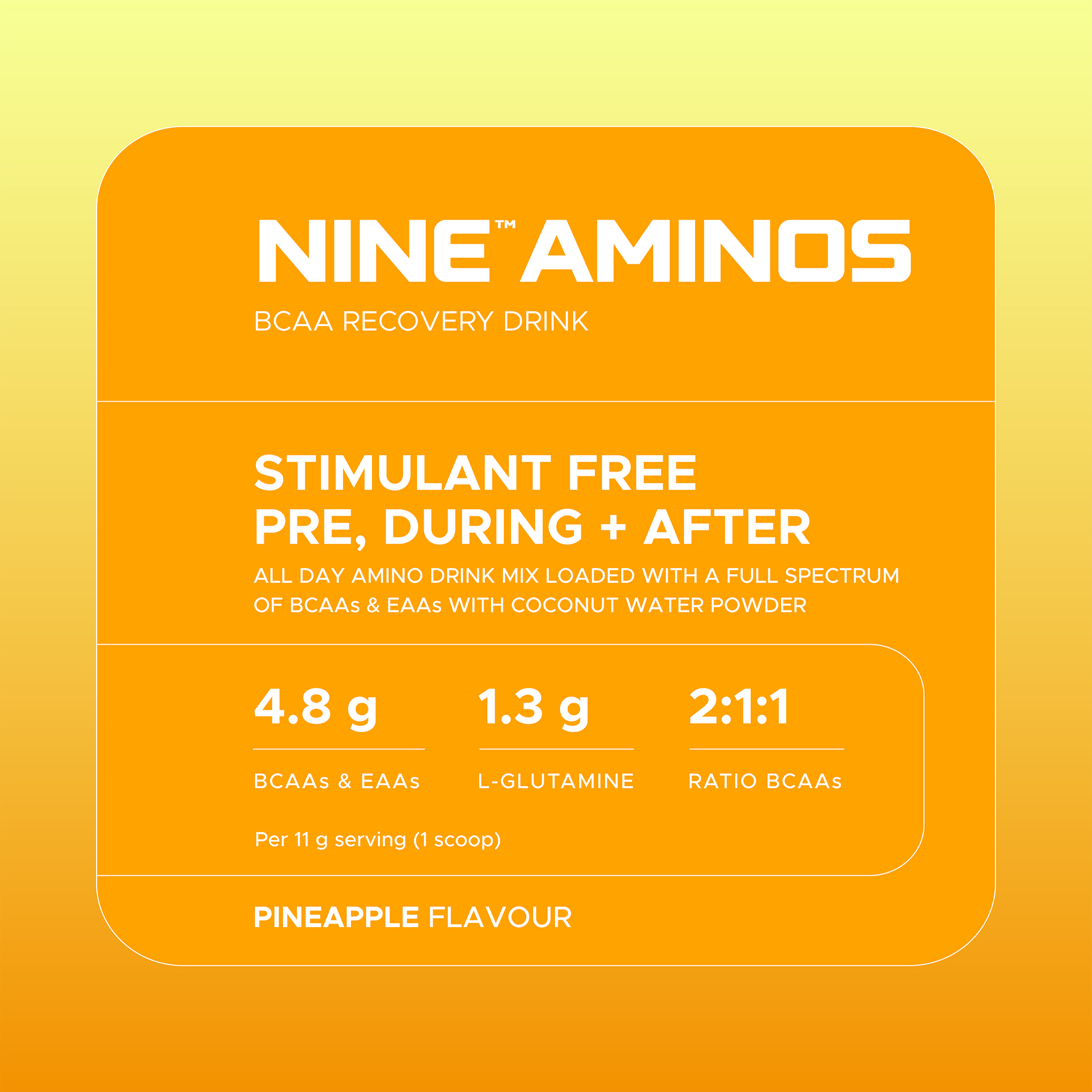 For those looking to take on the ultimate endurance challenges. Nine Aminos is a stimulant free electrolyte drink containing Full Spectrum BCAAs and EAAS with added Glutamine. All mixed within an hydrating coconut water formulation. Nine Aminos has been specially developed to help keep you hydrated and at your peak performance no matter your sport. This electrolyte drink can be enjoyed as a stimulant free intra-workout were the full spectrum 2:1:1 Ratio BCAAs help to replenish your muscles helping you to push harder and break your PB's. This product is excellent for supporting you at endurance events such as half and full marathons, Hyrox events, mud runs, triathlons, cycling and of course all you gym workouts.